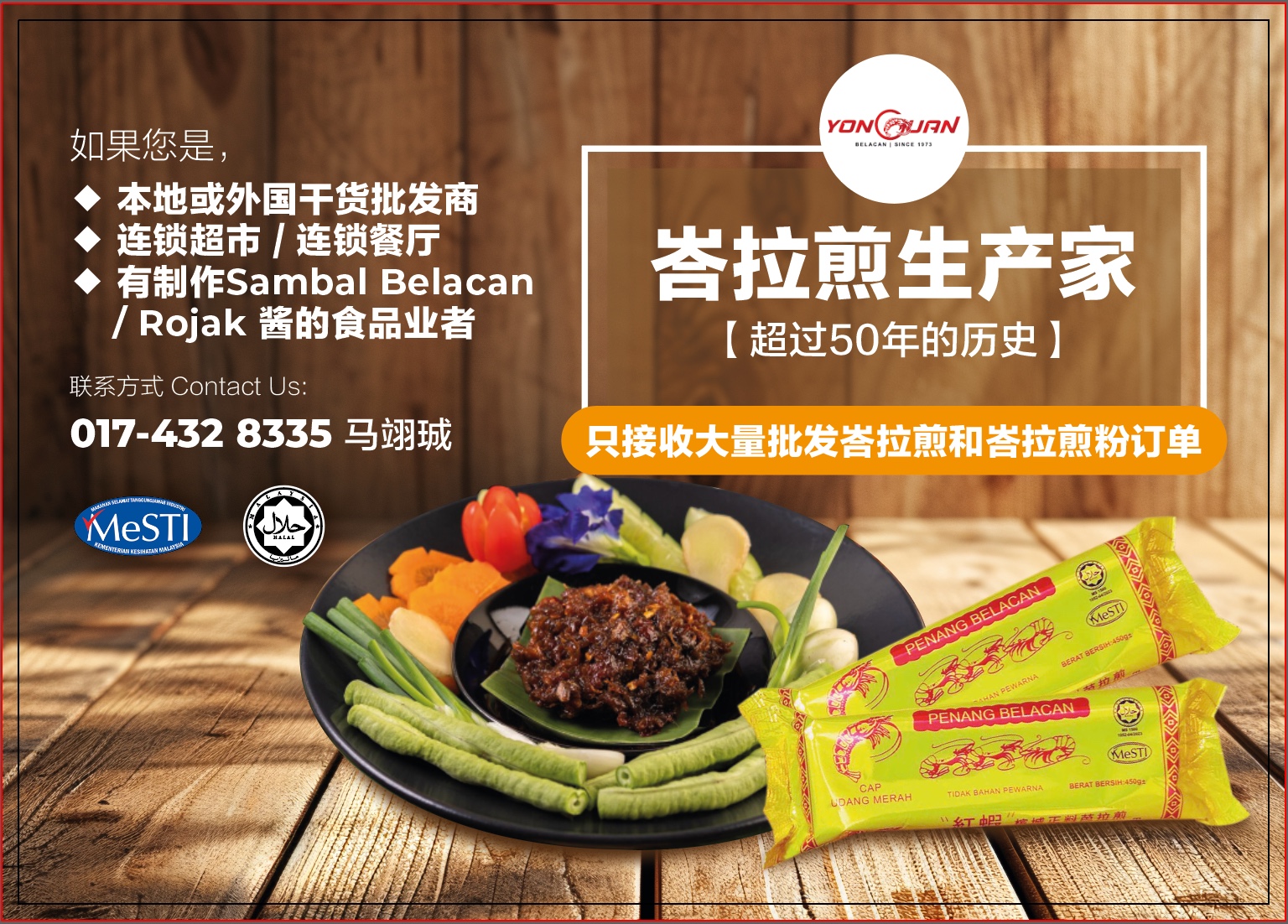We have been a Belacan manufacturer in Penang since 1973. Our product is made from 100% fresh shrimp to make sure our product is perfect to tickle your taste buds. We also make sure our product is clean, safe and tasty. Our product is halal and MESTI certified.